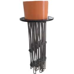 Heaters used to heat liquid are immersion heaters Tubular heaters with other sheathing of S.S. Brass & Copper are used to heat liquids, Semi solids, for corrossive liquids special tubular sheath are used in Alloys, Titanium For longer life of the element. Available in adaptor fittings from 1” B.S.P to 2” ½” B.S.P thread. And in various flanch sizes as suitable for the vessels.Replaceable type ceramic bobbin heater are also available in 1½inch to 2½inch B.S.P. Thread and in various flanch forms these heaters can be easily replaced without removing the contents from the vessel.